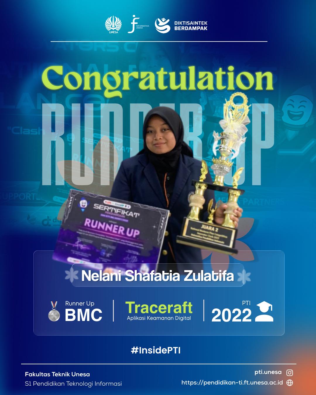 Nelani Shafatia Zulatifa dari S1 Pendidikan Teknologi Informasi Unesa Bersama Timnya berhasil meraih Runner Up BMC PTI 2022 dengan karyanya, 'Tracercraft: Aplikasi Keamanan Digital' yang diselengarakan oleh Kampus Tasikmalaya Universitas Pendidika