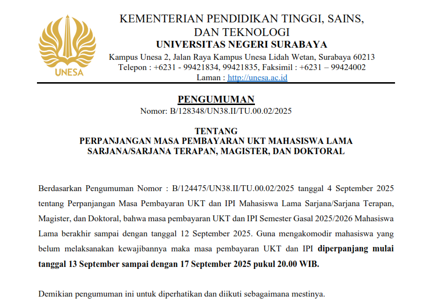Universitas Negeri Surabaya (UNESA) melalui surat pengumuman resmi nomor B/128348/UN38.II/TU.00.02/2025 menyampaikan bahwa masa pembayaran Uang Kuliah Tunggal (UKT) dan Iuran Pengembangan Institusi (IPI) bagi mahasiswa lama jenjang Sarjana/Sarjana Terapan, Magister, dan Doktoral untuk Semester Gasal Tahun Akademik 2025/2026 diperpanjang.